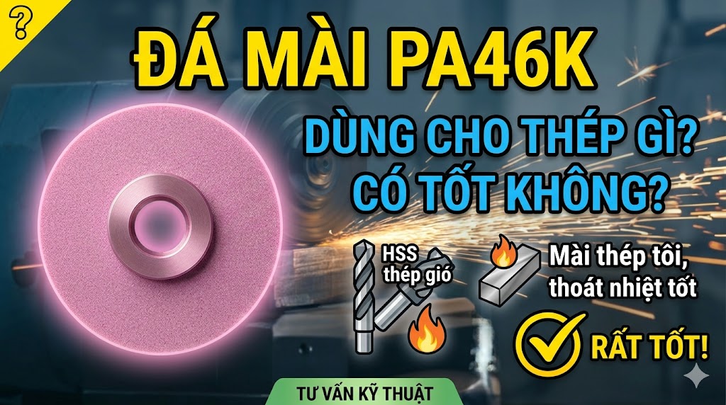 PA46K = đá mài đa năng, thiên về thép cứng + mài ổn định